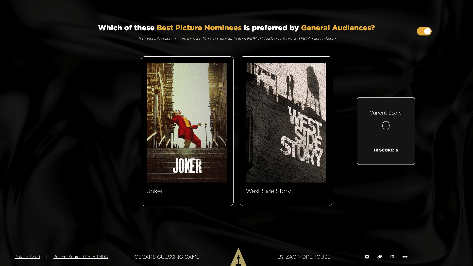 Developed an interactive JavaScript game where users guess which of two Best Picture nominees has a higher aggregate score. Features include dynamic game logic, cookies to track user data (e.g., high scores), and API integration with The Movie Database for real-time film information and posters. This is part of a larger exhibition focusing on Oscarbait and the legitimacy of Academy Awards winners.
