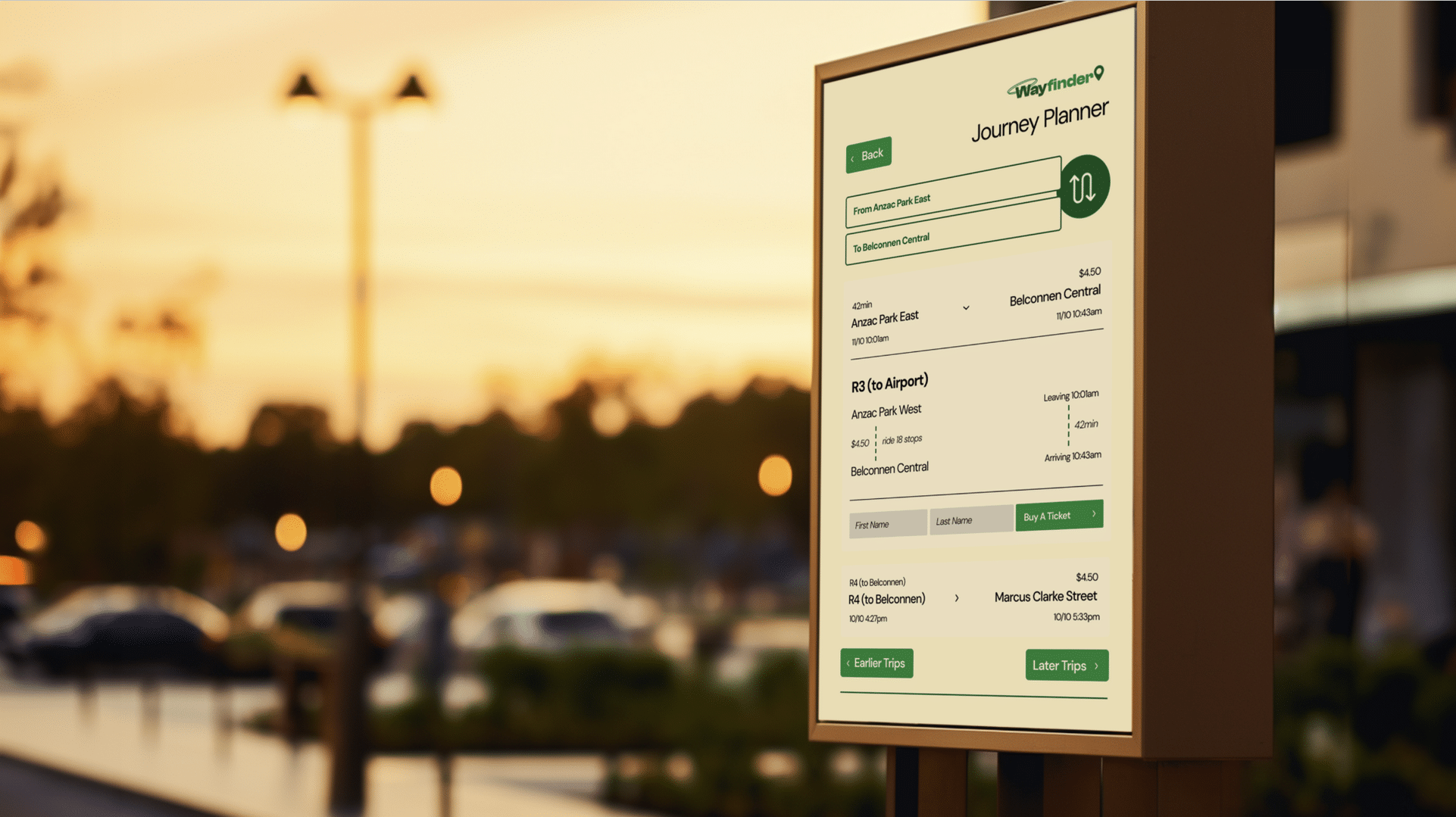 WayFinder is a set of comprehensive app and kiosk screens designed to modernise public transit systems by seamlessly integrating mobile devices with public transport terminals. This solution focuses on human-centered design, ensuring consistent, user-friendly access to services such as journey planning, ticketing, and real-time information across multiple touchpoints.